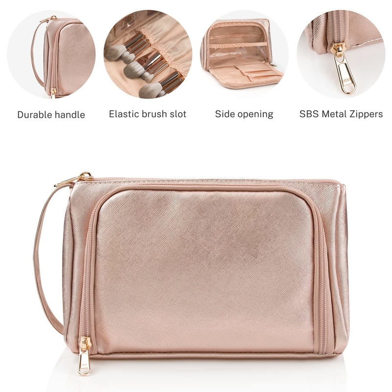 Ce sac de maquillage de voyage a un compartiment principal avec 2 petites poches transparentes pour organiser soigneusement votre maquillage.Les poches latérales peuvent contenir votre correcteur., des rouges à lèvres ou d' autres petits objets.